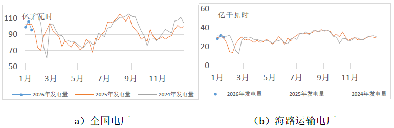 燃煤电厂生产方面,本周天气回暖明显,电厂发电量和日耗均环比较大幅度下降。根据中电联电力行业燃料统计数据,本周(1月9日至1月15日,下同),纳入统计的燃煤发电企业日均发电量环比(1月2日至1月8日,下同)减少9.7%,减少主要区域为华中(-21.6%)、华北(-18.5%),同比减少6.9%。日均供热量1548万吉焦,环比减少1.7%,同比减少0.1%。其中,海路运输电厂日均发电量环比减少6.0%,同比增长1.9%;日均供热量环比增长1.8%,同比增长5.2%;日均耗煤量环比减少5.2%,同比增长2.3%。电厂库存量12364万吨,较1月8日减少210万吨;电厂库存可用天数较1月8日减少0.1天。
