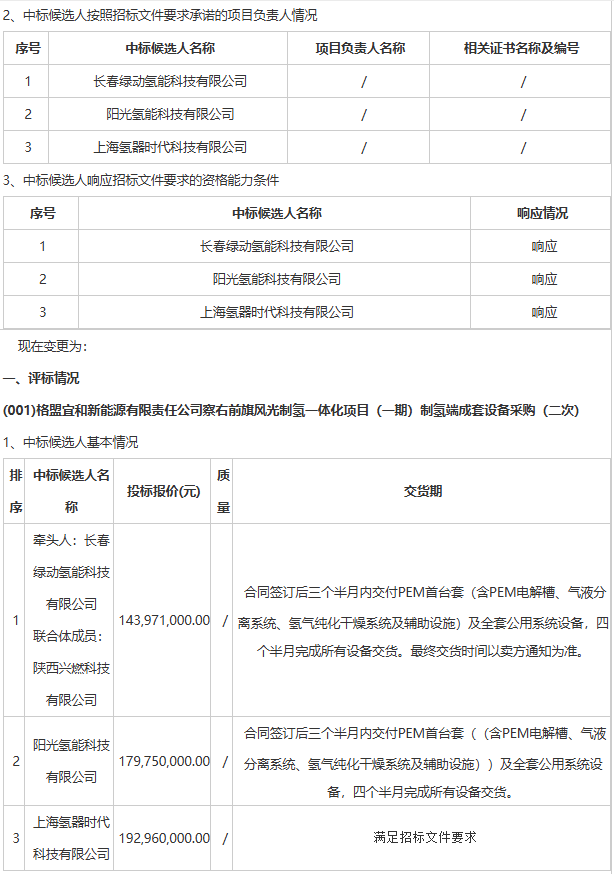公告显示,第一中标候选人为,长春绿动氢能科技有限公司,投标报价为143971000元;第二中标候选人为阳光氢能科技有限公司,投标报价为179750000元;第三中标候选人为上海氢器时代科技有限公司,投标报价为192960000元。
