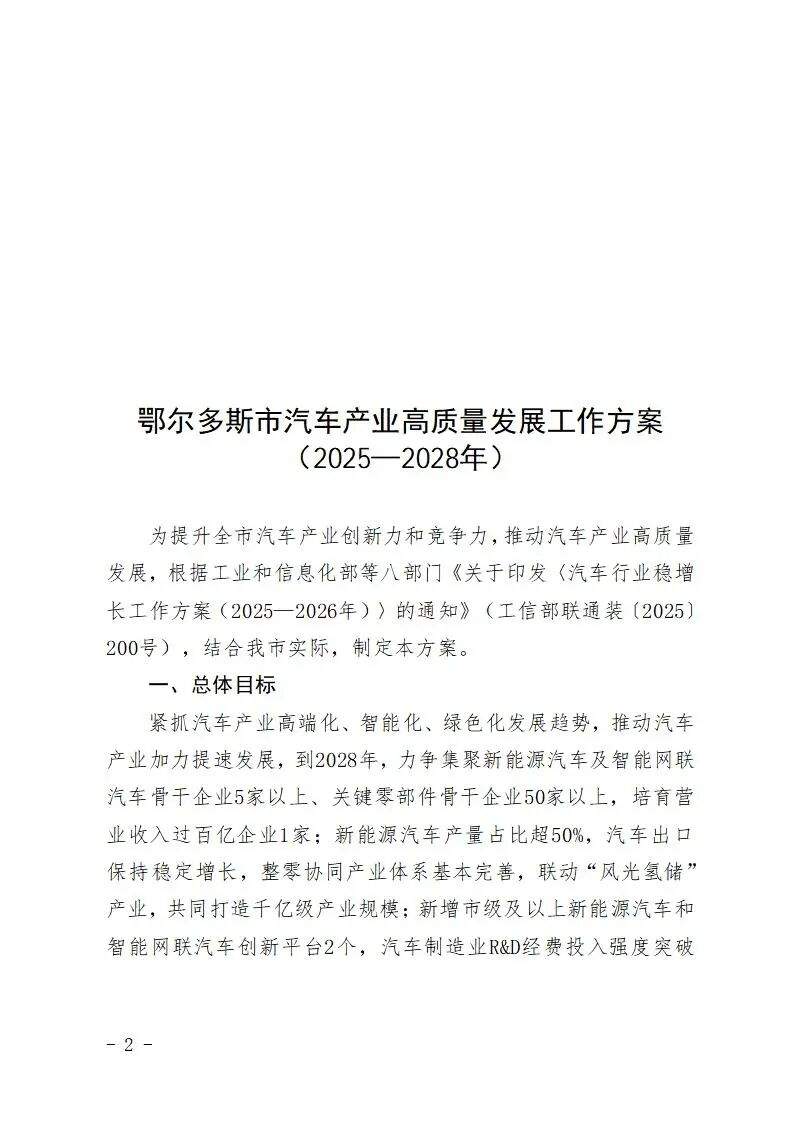 北极星氢能网获悉,近日,鄂尔多斯市人民政府办公室关于印发汽车产业高质量发展工作方案(2025—2028年)的通知。