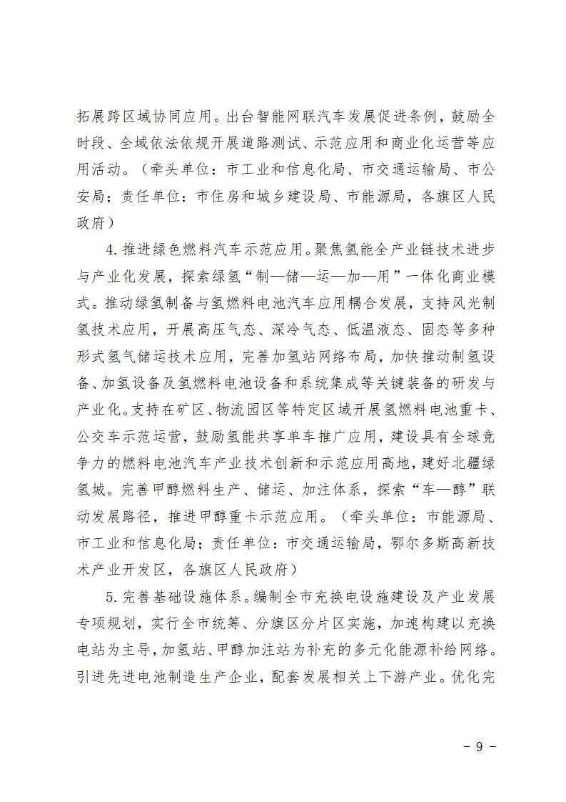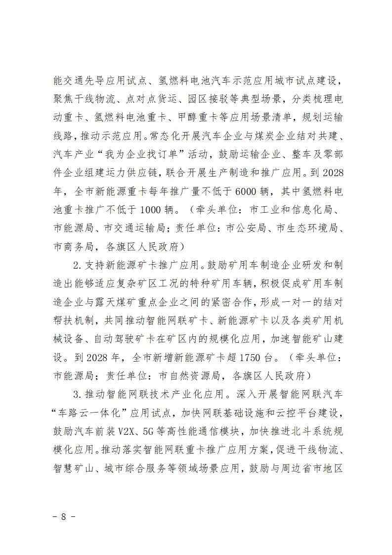 支持在矿区、物流园区等特定区域开展氢燃料电池重卡、公交车示范运营,鼓励氢能共享单车推广应用,建设具有全球竞争力的燃料电池汽车产业技术创新和示范应用高地,建好北疆绿氢城。完善甲醇燃料生产、储运、加注体系,探索“车—醇”联动发展路径,推进甲醇重卡示范应用。