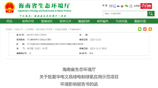 2025年12月31日,海南省生态环境厅官网发布关于批复华电文昌绿电制绿氢应用示范项目环境影响报告书的函。