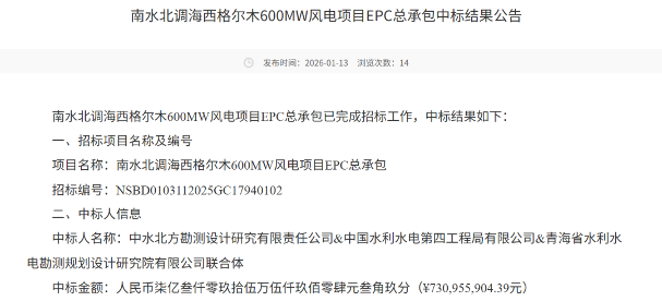 北极星风力发电网获悉,1月13日,《南水北调海西格尔木600MW风电项目EPC总承包中标结果公告》发布。