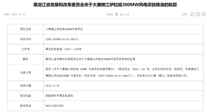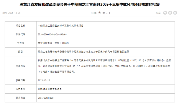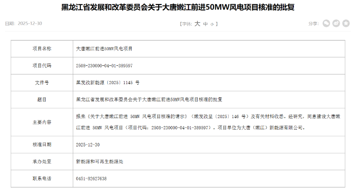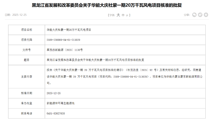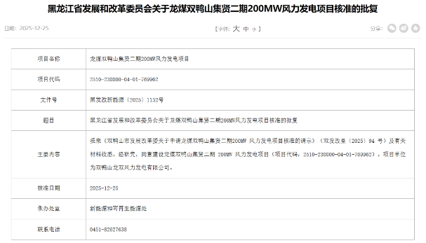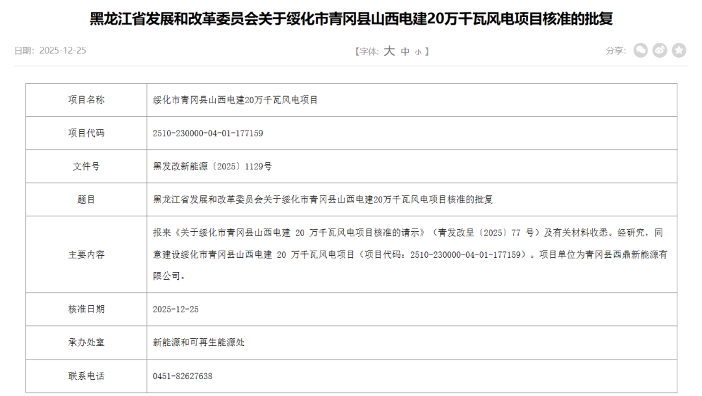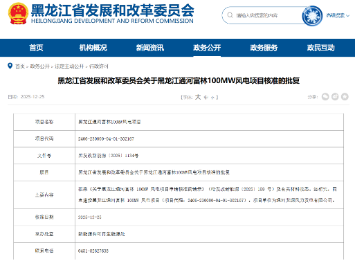 2250MW!黑龙江核准批复10个风电项目 日期: 2026-02-12 06:38 栏目:新能源 浏览: 2025年12月,黑龙江省发展和改革委员会接连核准10个风电项目,总装机2250MW。详情如下: 相关阅读:1033个风电项目获批!超150GW掀风电开发热潮 127万千瓦源网荷储一体化等项目,核准获批! 标签: 上一篇:隆基滁州基地成为首家荣获全球光伏行业SSI-ESG最高等级认 下一篇:长源电力增资8842万建设80MW渔光互补项目 相关推荐 2025年,风电企业加快布局氢氨醇 国家电投下属企业严正声明! 金风科技3GW风电制氢项目!取得预审批复 +4项!海上风电行业标准获准发布