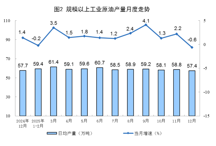 原油生产保持稳定。12月份,规上工业原油产量1780万吨,同比下降0.6%;日均产量57.4万吨。