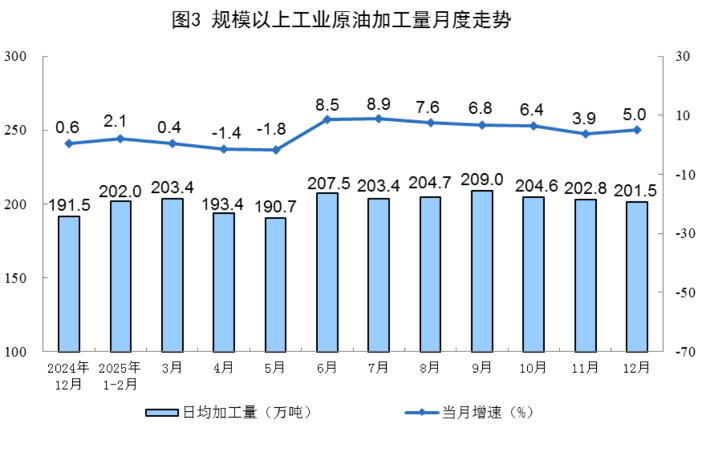 原油加工增速加快。12月份,规上工业原油加工量6246万吨,同比增长5.0%,增速比11月份加快1.1个百分点;日均加工量201.5万吨。