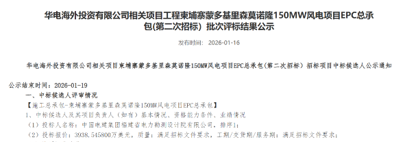 1月16日,华电海外投资有限公司相关项目柬埔寨蒙多基里森莫诺隆150MW风电项目EPC总承包(第二次招标)招标项目中标候选人公示。
