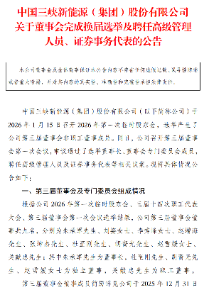 2026年1月16日,三峡能源发布公告,宣布公司董事会换届选举及高级管理人员聘任工作圆满完成。根据公告,公司第三届董事会共由9名董事组成,朱承军当选董事长,杜至刚、胡裔光、赵雪媛担任独立董事,关献忠为职工董事。董事会下设四大专门委员会,分工明确保障公司规范运作。