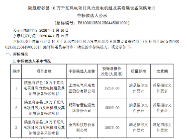 北极星风力发电网获悉,1月16日,陕氢府谷县10万千瓦风电项目风力发电机组及其附属设备采购项目中标候选人公示。