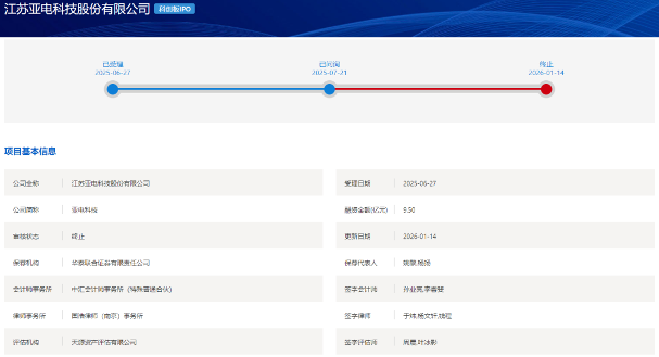 2026年1月14日,上交所官网显示,因江苏亚电科技股份有限公司及其保荐人撤回发行上市申请,上交所终止其科创板发行上市审核。