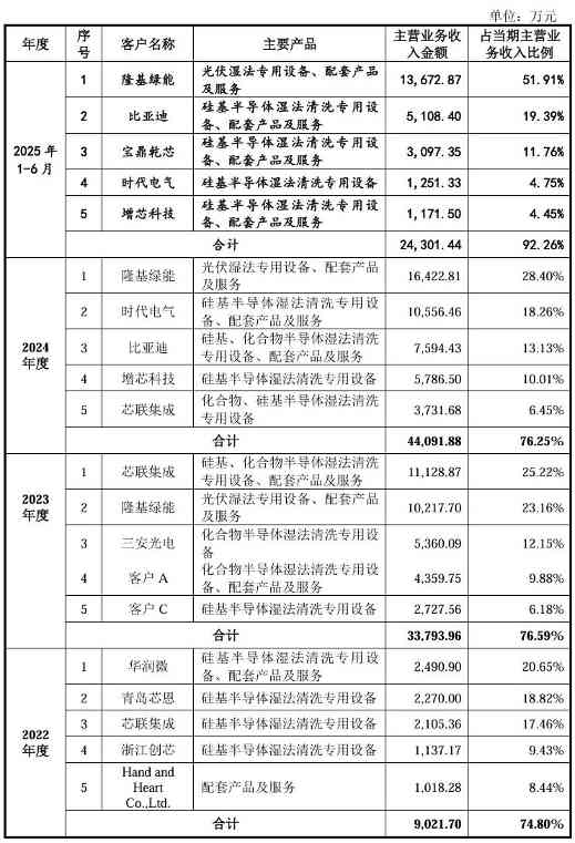 据披露,公司前五大客户销售金额占当期主营业务收入的比例分别为74.80%、76.59%和76.25%和92.26%,客户集中度较高。其中,2025年1-6月,公司向隆基绿能销售光伏湿法专用设备、配套产品及服务金额为13,672.87万元,占主营业务收入比例为51.91%,存在单一客户收入占比超过50%的情形。