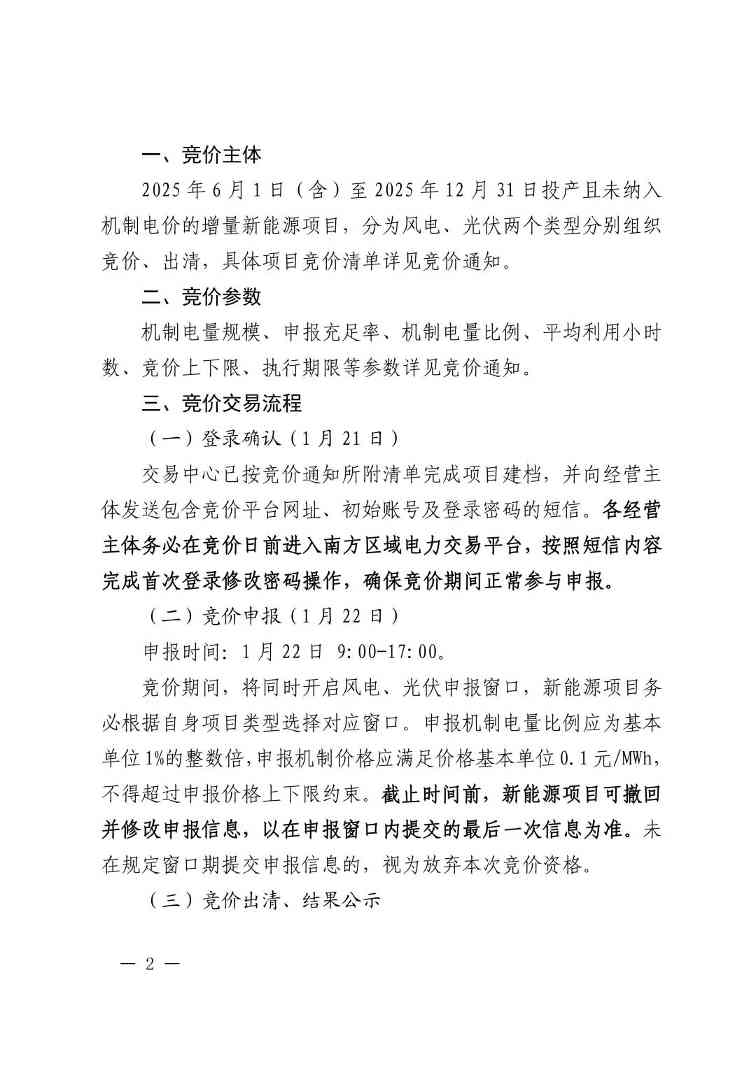 按照《省发展改革委关于开展2025年新能源增量项目机制电价竞价工作的通知》(黔发改价格〔2026〕35号),贵州电力交易中心将于1月22日组织开展2025年新能源增量项目竞价交易,请符合《贵州省2025年新能源增量项目竞价清单》申报条件的竞价主体及时确认是否收到竞价短信通知,并于1月21日登录短信中的网址,确认账号是否能正常使用,首次登录竞价平台需修改密码。申报、撤回、重新提交等操作均通过该网址开展。申报过程中,请各竞价主体及时登录查询项目状态,确保顺利竞价。详情请见公告。