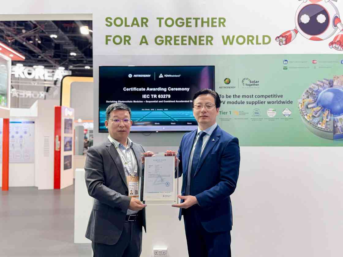 1月13日,在阿联酋阿布扎比举办的世界未来能源峰会(World Future Energy Summit 2026)现场,正泰新能正式获颁由国际独立第三方检测、检验和认证机构德国莱茵TÜV大中华区(以下简称“TÜV莱茵”)颁发的全球首张n-TOPCon组件IEC TR 63279 序列及综合加速应力测试证书。