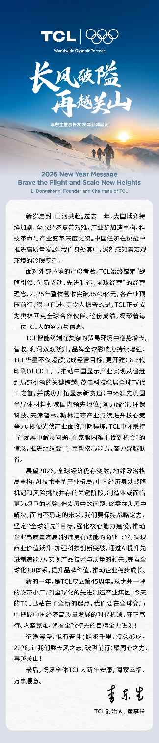 长风破隘 再越关山丨李东生董事长2026年新年献词 日期: 2026-01-22 06:37 栏目:新能源 浏览: 原标题:长风破隘,再越关山丨李东生董事长2026年新年献词 标签: 上一篇:潮汐竞速 海陆联动 启东市吕四滩涂渔光互补光伏项目一期400 下一篇:共建东北零碳园区新标杆 | 辽宁省法库县与正泰新能源签署战略 相关推荐 超12亿!华能483MW海上风电项目中标结果定了 全球首张!正泰新能获颁TÜV莱茵IEC TR 63279序列及综合加速应力测试证书 WFES 2026 | 正泰新能ASTRO N7 Pro闪耀阿布扎比 中节能:公司小面积钙钛矿晶硅叠层电池效率已超过30%