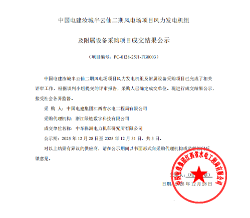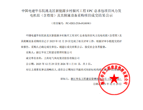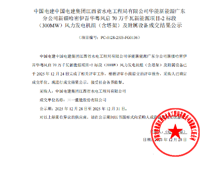 12月29日,中国电建发布隆林隆或风电场二期工程、洮北区新能源乡村振兴工程、汝城半云仙二期风电场项目、华能哈密伊吾华粤风启70万千瓦新能源项目机组采购中标公示,规模共计1066.2MW。其中:三一重能中标700MW,金风科技中标300MW,中车株洲所中标50MW,电气风电中标16.2MW。