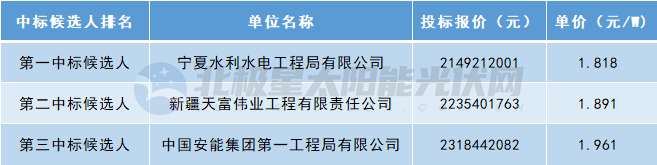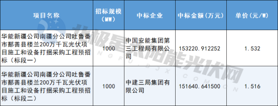 华能新疆公司南疆分公司吐鲁番市鄯善县楼兰200万千瓦光伏项目施工和设备打捆采购工程招标,共分为2个标段,各标段为1000MW。11月,该基地项目中标结果公示,中国安能集团第三工程局有限公司、中建三局集团有限公司中标,单价分别为1.532元/W、1.516元/W。