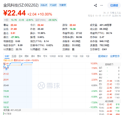 2026年首个交易日,沪深股市喜迎"开年红",主要股指全线高开高走,其中风电板块成为绝对领涨先锋,掀起一波强劲上涨热潮。风电龙头金风科技不负众望强势封板,以10.00%的涨幅报收22.44元,总市值飙升至948.11亿元,距离千亿市值仅一步之遥,成为市场焦点中的焦点。