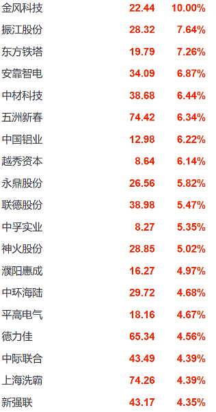 板块内多点开花,掀起普涨狂潮。振江股份大涨7.64%,东方铁塔上涨7.26%,中材科技、五洲新春等多只风电及材料类个股涨幅均超6%;中环海陆、平高电气、德力佳、新强联等一众风电设备企业表现亮眼,涨幅均突破4%,满屏飘红的行情,尽显市场对风电等可再生能源领域的狂热追捧。