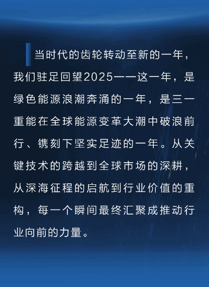 三一重能2025十大高光时刻 日期: 2026-02-01 06:37 栏目:新能源 浏览: 原标题:三一重能2025十大高光时刻 标签: 上一篇:坚韧、温情与全球化:隆基年终对话里的三个片段 下一篇:光伏同比增长34.43%!桂冠电力公布2025年发电量情况 相关推荐 超12亿!华能483MW海上风电项目中标结果定了 全球首张!正泰新能获颁TÜV莱茵IEC TR 63279序列及综合加速应力测试证书 WFES 2026 | 正泰新能ASTRO N7 Pro闪耀阿布扎比 中节能:公司小面积钙钛矿晶硅叠层电池效率已超过30%