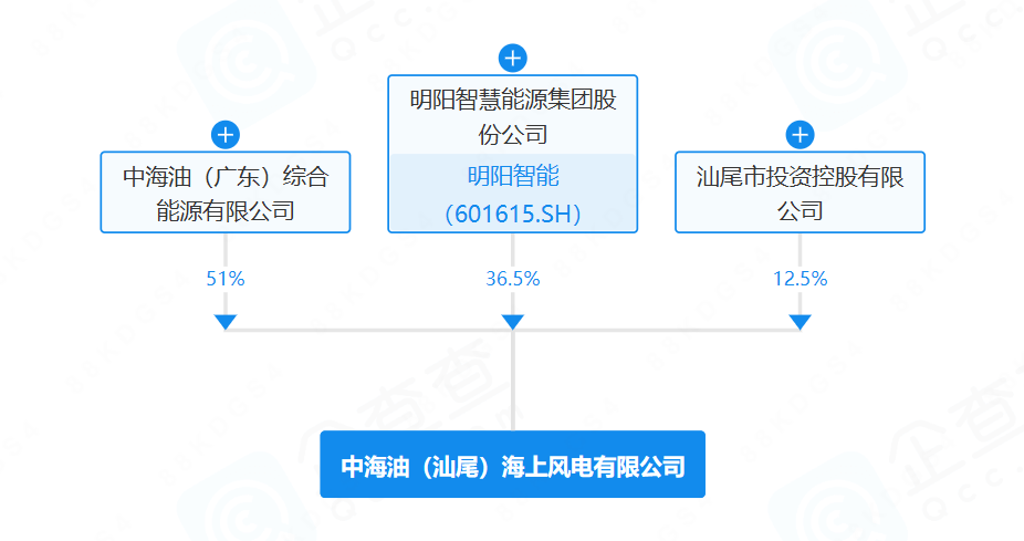 企查查显示,中海油(汕尾)海上风电有限公司成立于2025年12月30日,注册资本为5000万元,由中海油(广东)综合能源有限公司(51.00%)、明阳智慧能源集团股份公司(36.50%)、汕尾市投资控股有限公司(12.50%)共同持股。