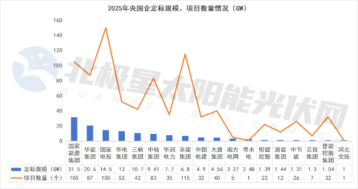 无论是定标规模还是项目数量,国家能源集团、华能集团、国家电投三大巨头,都以绝对优势领跑。国家能源集团的定标规模高达31.5GW,是华能集团的1.5倍。(两家企业订单详情见下文)