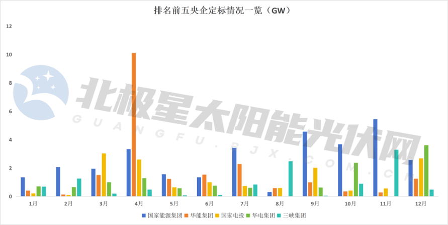 北极星太阳能光伏网统计发现,国家能源集团、华能集团、国家电投、华电集团月平均定标规模分别达到2.629GW、1.719GW、1.21GW、1.216GW,国家能源集团除8月仅有超300MW的定标规模,其他月份定标水平均有GW级;华能集团4月达到全年峰值,高达10.1GW,以大基地运维项目居多,多数月份的定标量集中在0.13-2.28GW区间;国家电投定标项目集中在3月、4月、9月、12月,合计10.3GW;华电集团在下半年迎来运维高峰,12月有超3GW定标规模,领先于其他央企;三峡集团上半年表现平淡,进入下半年迎来运维旺季,11月定标量超3GW。
